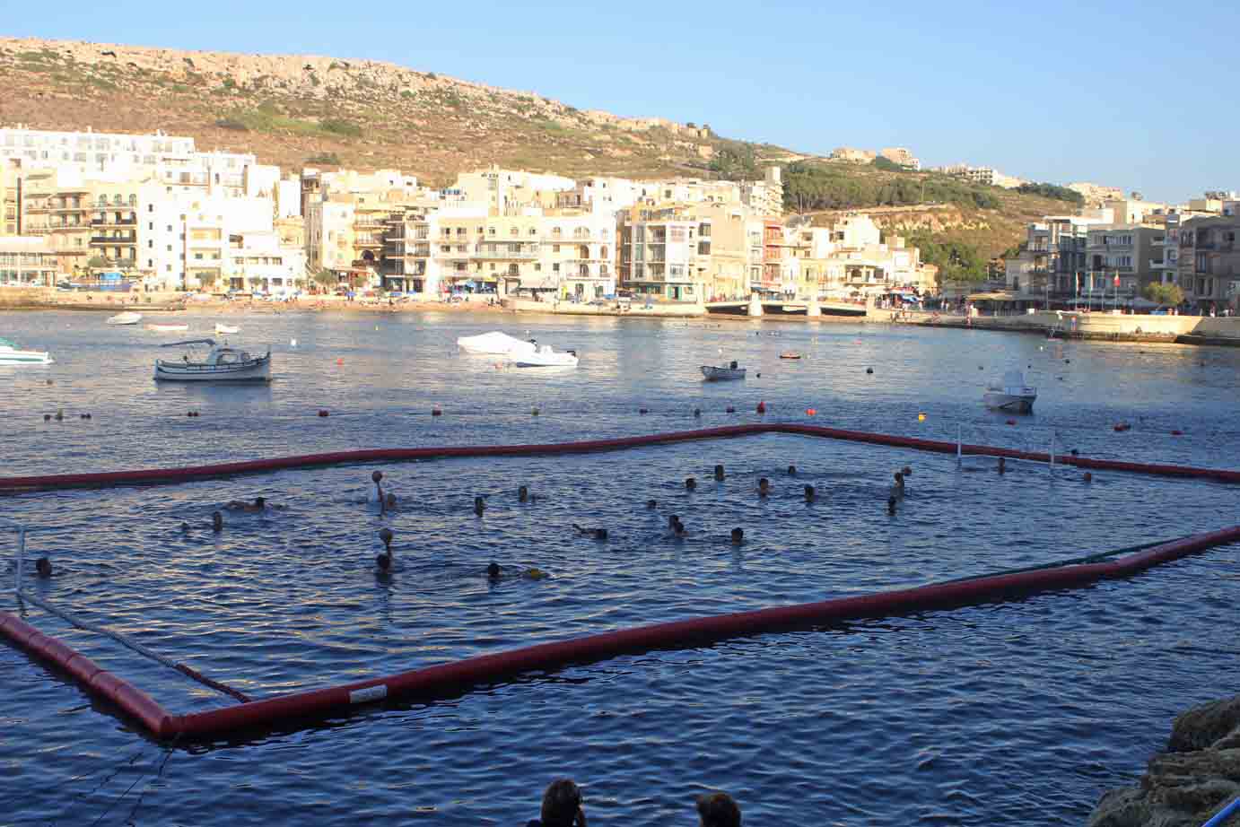 The Boomswim pool is a an inflatable boom with an attached hanging net that creates an enclosed safe swimming zone in the water.